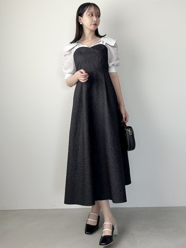ドレスのようなシルエットで上品な印象に♡上品ワンピース 【アイテム】 大き目の襟でデコルテを広めに取りすっきりとさせたシルエットが堅苦しさをそぎ落としてくれます。 ふんわり広がるドレスの様なシルエットがクラシカルムードを高めます。 ジャカードで軽さと上品さを兼ね揃えたアイテムです