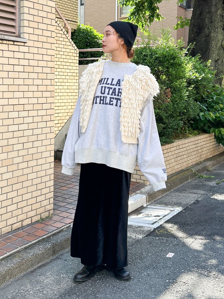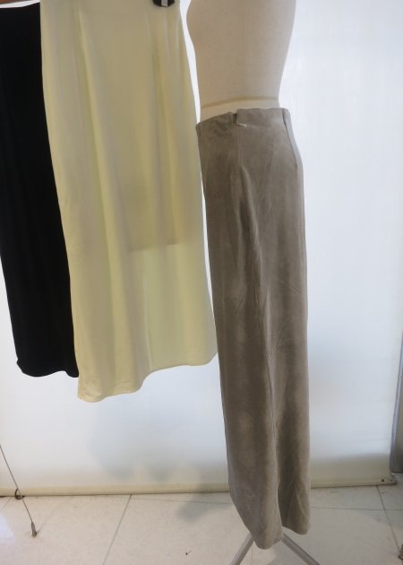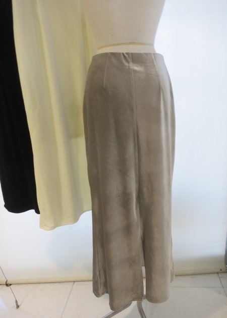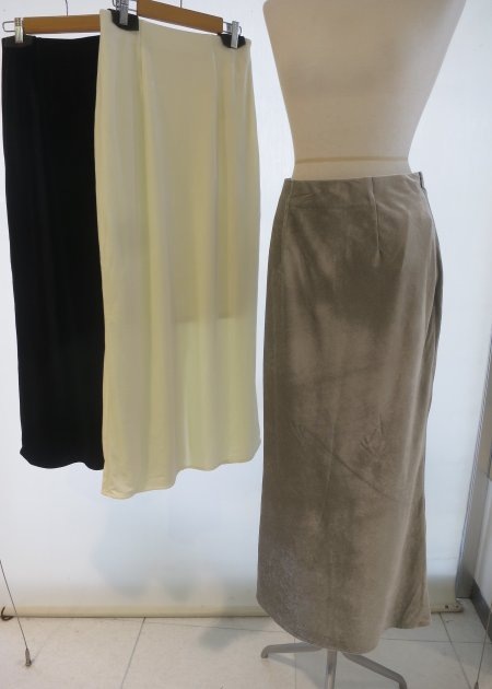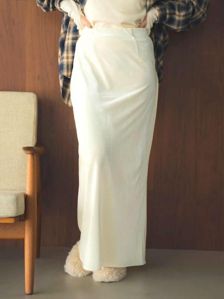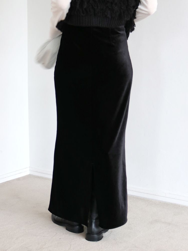 細身のシルエットで洗練されたムードで着ていただけます。 ウエストは表から見えないゴムの仕様なので、トップスに響かずキレイに着ることができます。 生地はバイアスで裁断していることで、伸びがよく落ち感もでるところが良いポイント。 裏地付きなので透け感も気にせずご着用いただけます。 ■生地感 毛足が短めのベロア素材を使用。 落ち着いた光沢感で、取り入れやすい生地感です。