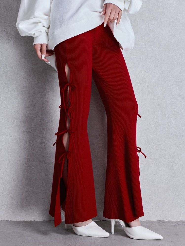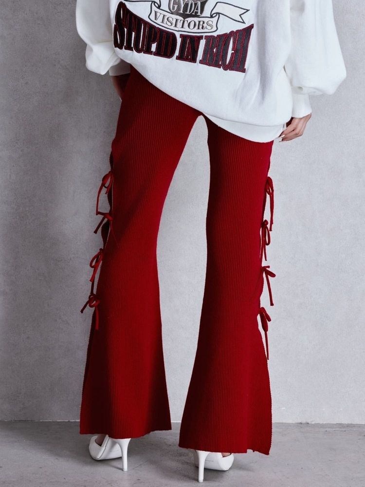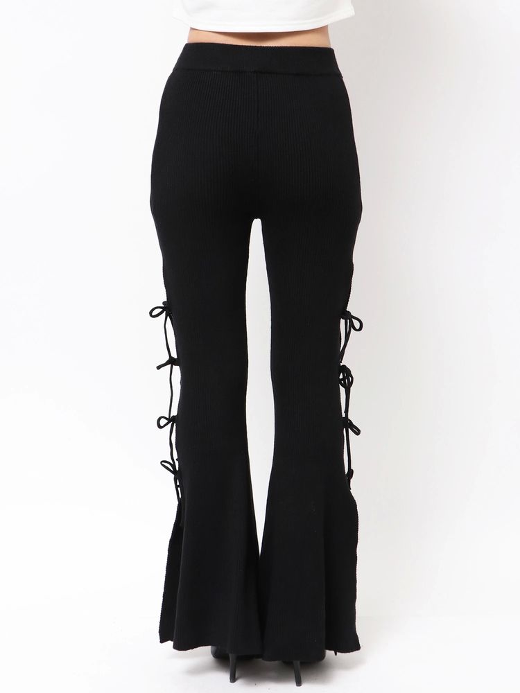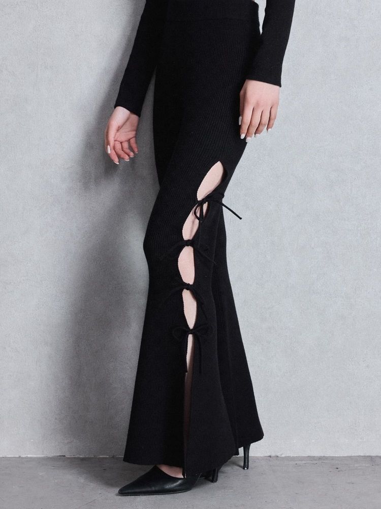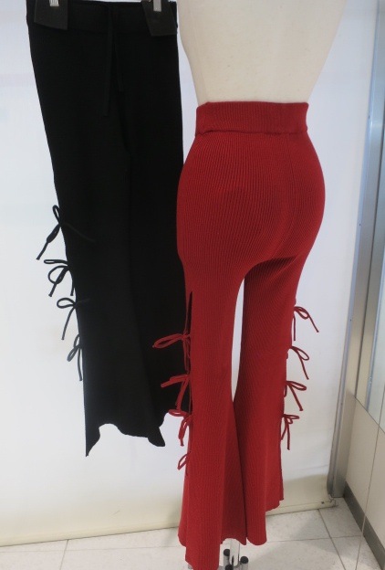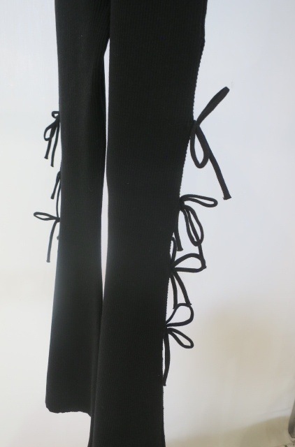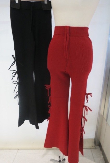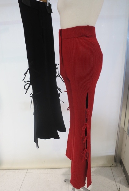 リブ編みニット素材を使用し、 サイドスリット+リボンが、今っぽいディテールとセクシーなデザイン。 タイトフレアのシルエットで脚長効果抜群の1着です。 ウエストのゴム仕様と、内紐付きなのでサイズ調整もしやすく穿き心地も◎