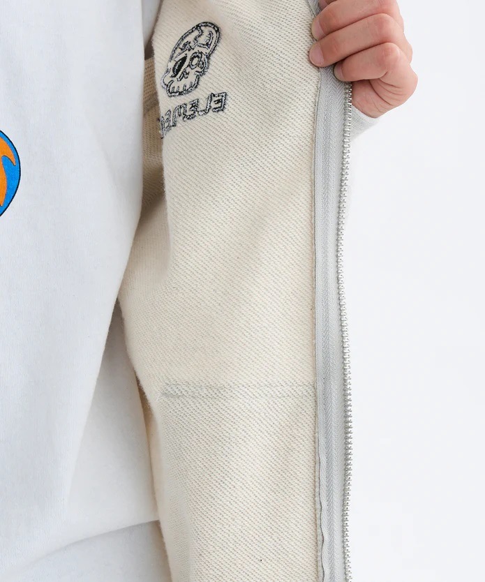 コットン100%でオープンエンド300gのフルジップパーカー。裏地は肌触りの良い裏毛。 左胸にはアーティスト"TIMBER"が描くドクロのキャラクターを刺繍で表現。 フードにも"TIMBER"が描く3人のドクロのキャラクターをプリントで表現し、アウターの上からでもアートが見える仕様。