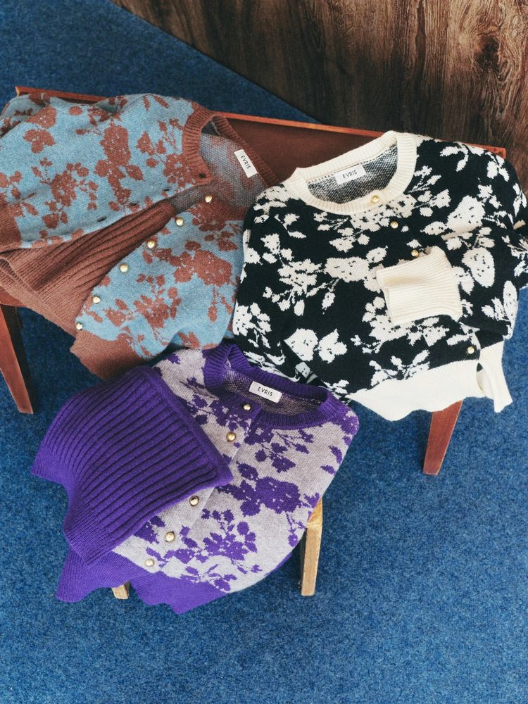 気分で選べる主役ニットが登場♡ ショコラブルー/パープル/モノトーンの3色展開 どの色も主役級、あなたは何色派?? ■カラー展開 ショコラブルー♥大人可愛いを叶える甘辛MIX パープル♥遊びのアクセントカラー モノトーン♥媚びない強さのモノトーン ■デザイン オリジナルの花柄をジャガード編みしたアンサンブルニットです。 インナーにはリブ編みのベアトップをセットにしています。 カーディガンはショート丈で肩部分にはタックを入れたデザインになっています。 フロントはボール状の金ボタンを使用しており、裾はあえてスリットを入れています。 ボタンを開けて着用しても可愛いですし あえて上だけ止めてビスチェをチラ見せするスタイルもおすすめです。 EVRISらしい配色がポイントです。
