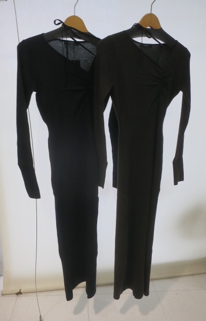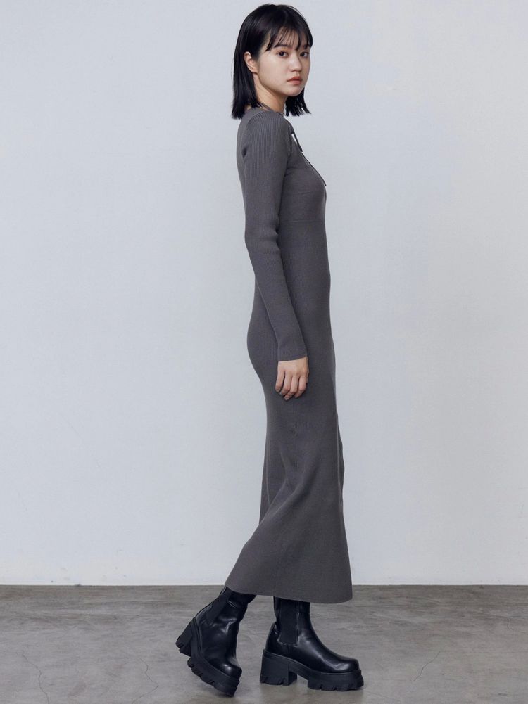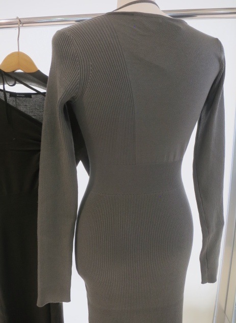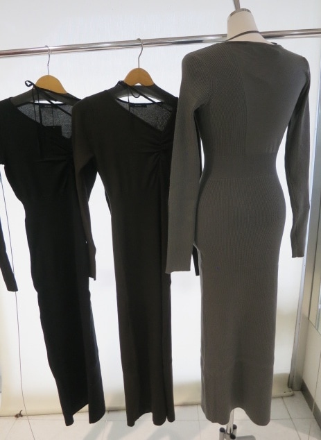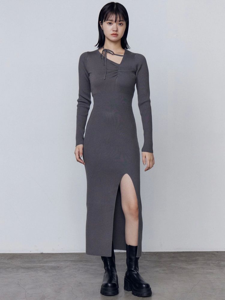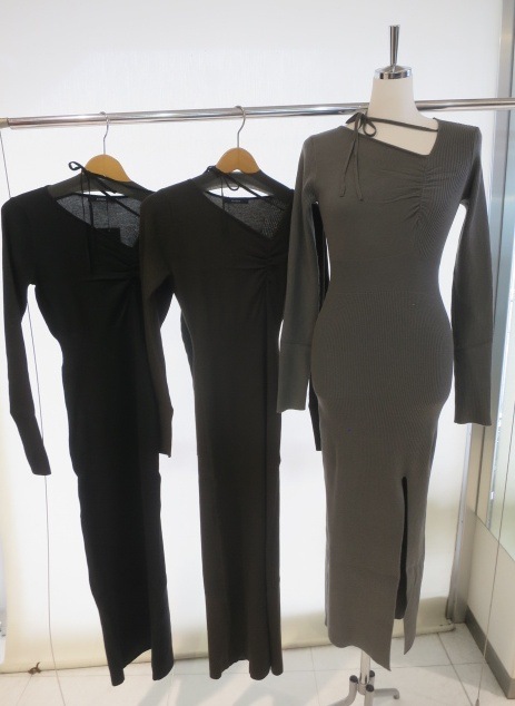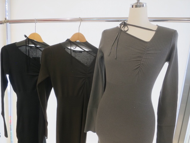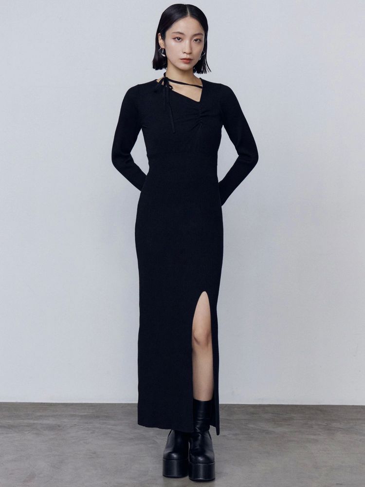 トレンド感のあるギャザーデザインが目を引くニットワンピース ■デザイン ネックのチョーカー紐をアクセントにしています。 紐はリボン結びや、紐先を垂らしたままなどお好みで着用していただけます。 身頃はギャザーを境に左右で編み地を変えているのでシンプルになり過ぎず、アウターを脱いだ際にも1枚で決まるワンピースです。 ボディはタイトめに作成し、体のラインに沿う女性らしいシルエット。 フロントにはスリットを入れ、程よい肌見せで抜け感も演出しています。 足さばきも良くストレスフリーに着用いただけます。