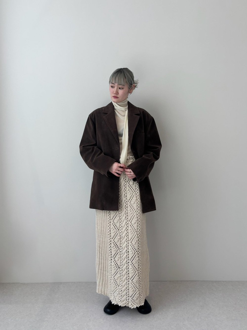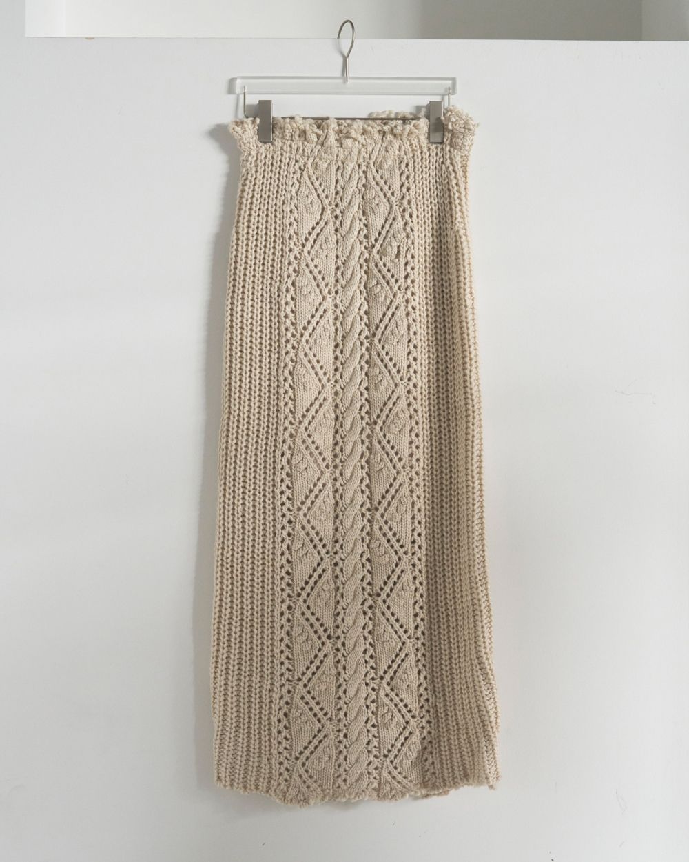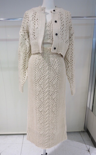 太めの糸でざっくりと編み上げたニットスカート。ケーブル編みをベースに、様々な模様編みをミックスさせたフロントラインをアクセントに効かせた一枚。ラフに仕上げた、ウエスト上端と裾のカットオフディテールもポイント。柔らかな伸縮性のある裏地付き仕様です。程良く体に馴染むストレートラインで、ウエストはゴム仕様なので楽に履いていただけます。同じ編み地のCable Knit CardiganやCable Knit Skirtとのセットで着ていただくのもおすすめです。