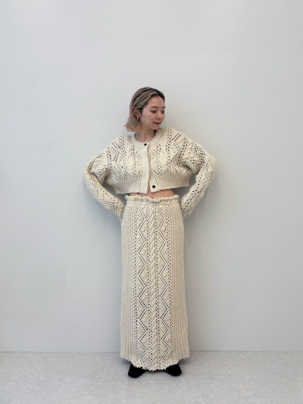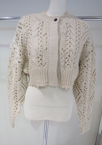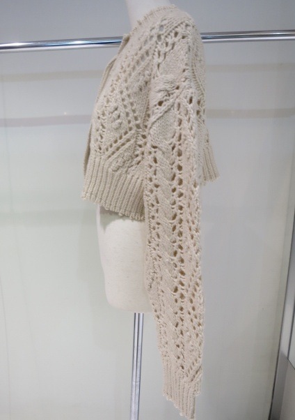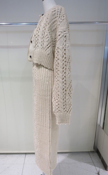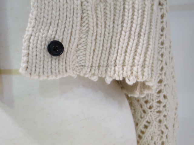 太めの糸でざっくりと編み上げたニットカーディガン。ケーブル編みをポイントに、様々な模様編みをミックスさせています。透かし編みもあり、軽やかで抜け感ある仕上がりに。襟や袖口、裾の端のカットオフディテールがラフで可愛い一枚。前後2WAYで着用可能なので、ボタンを留めてどちらを前にしてもプルオーバーとしても着ていただけます。同じ編み地のCable Knit CardiganやCable Knit Skirtとのセットで着ていただくのもおすすめです。