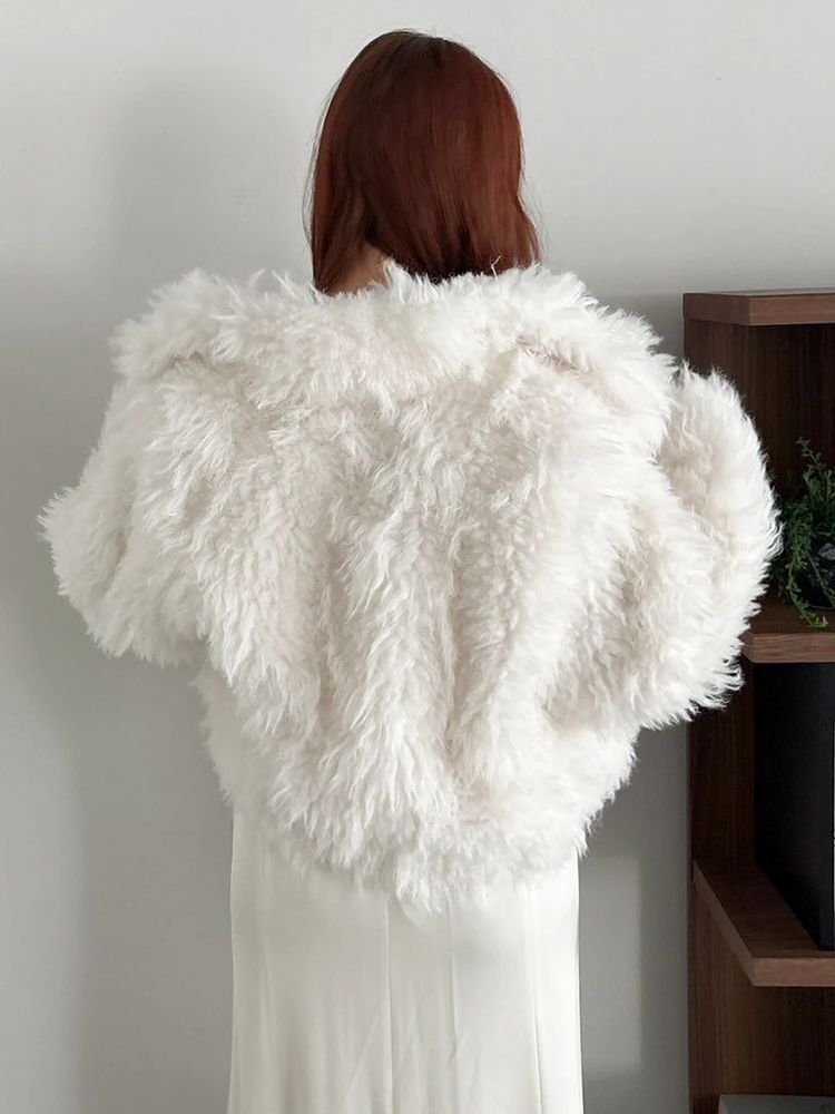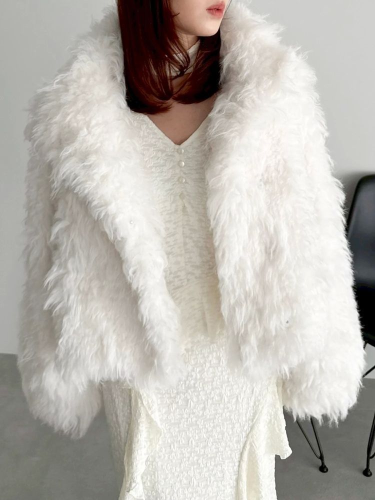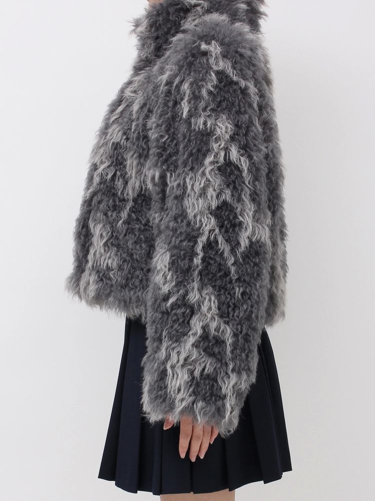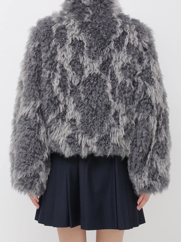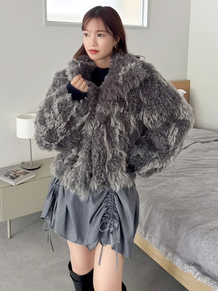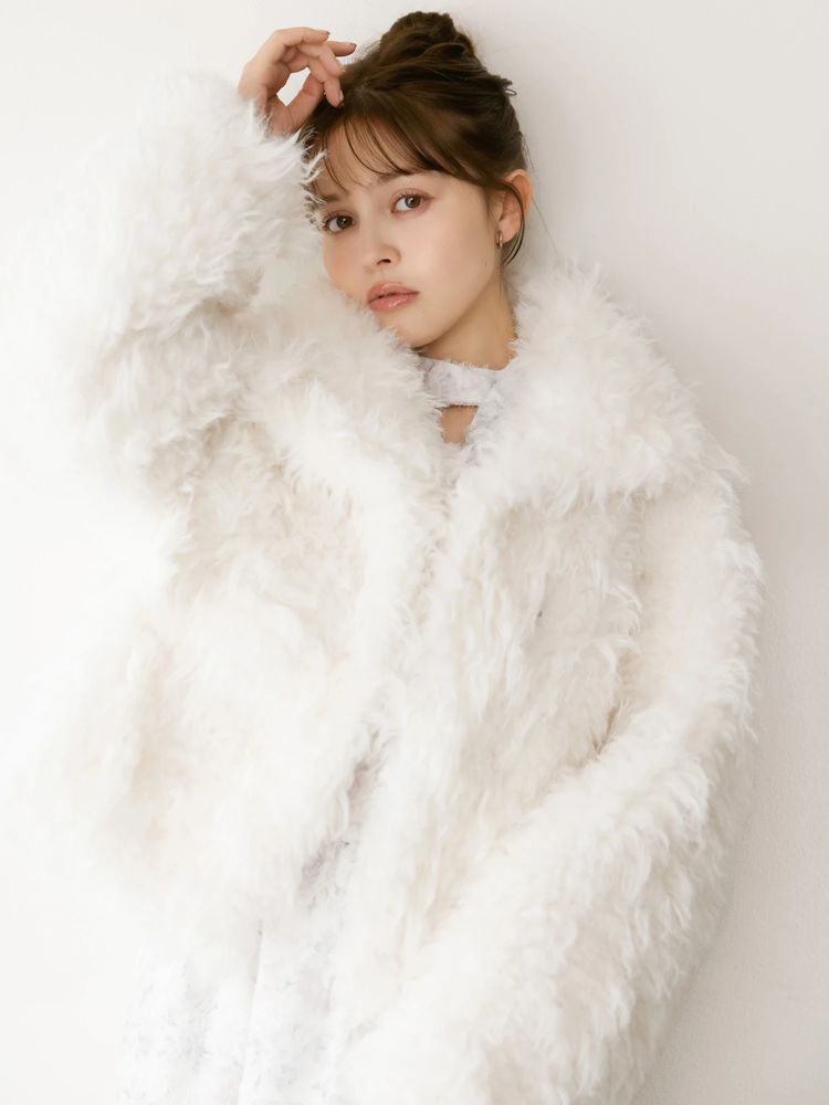 もこもことしたボアとふわふわのファーをミックスした、シーズンムードたっぷりのショートコート。 異素材の組み合わせが立体感と表情を生み出し、1枚で存在感のあるスタイルに。 軽量ながらも暖かく、寒い季節のデイリー使いにぴったり。ショート丈でバランスが取りやすく、ボリュームのあるボトムとも好相性。