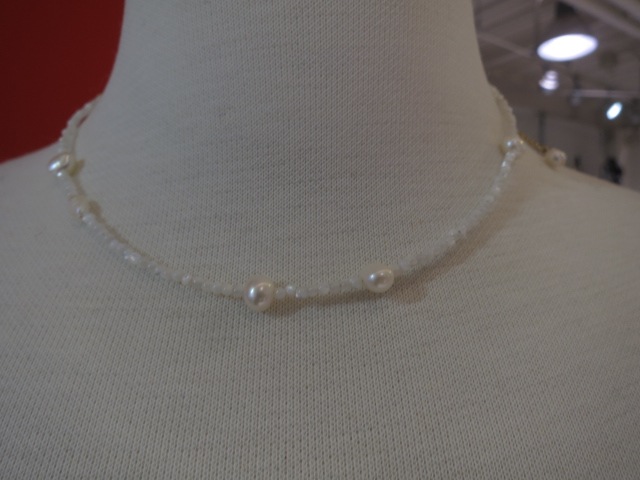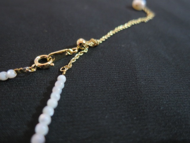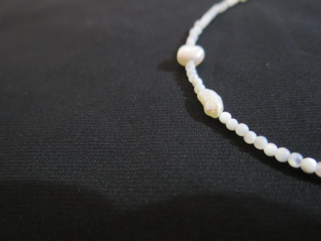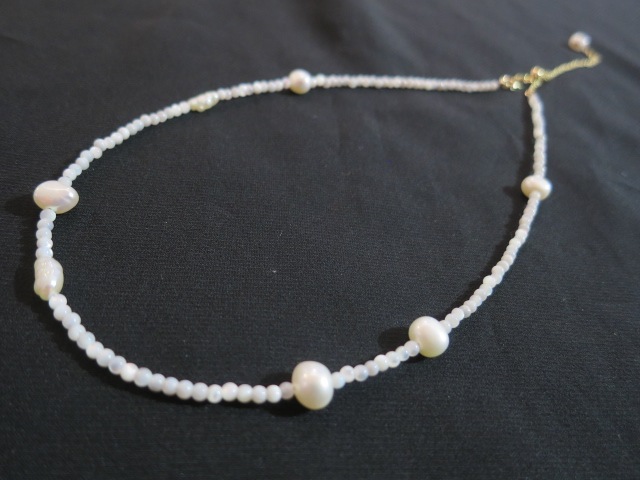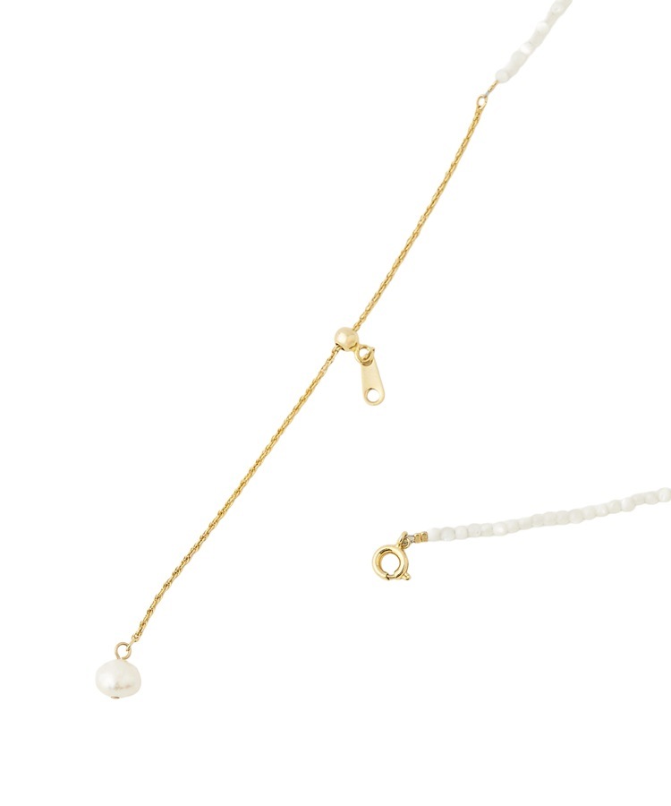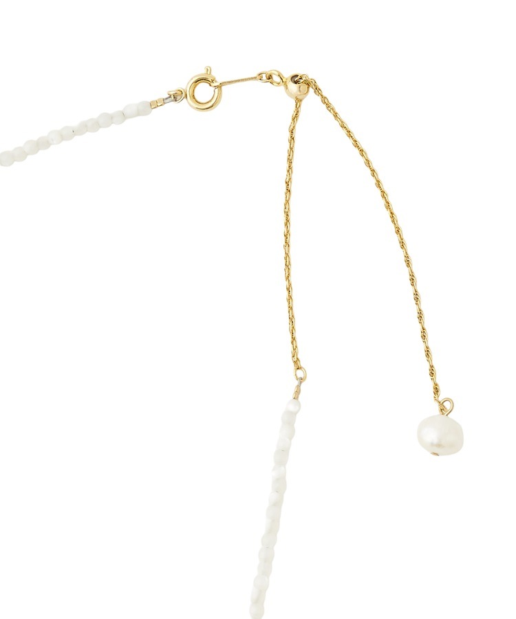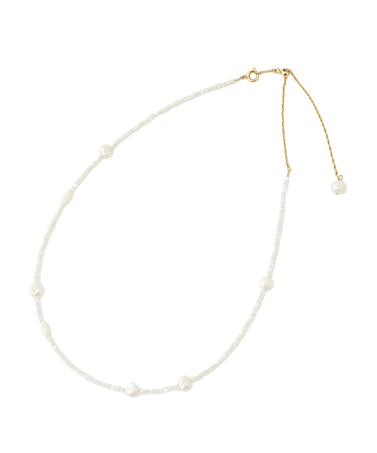 大小粒の大きさの異なるホワイトパールがアクセントになったネックレスです。華奢なパールの間にコントラストのあるパールを散りばめ、軽やかでナチュラルな印象に。アジャスター付きなので長さ調整が可能です。不揃いなサザレパールが、天然ならではの動きを生み出し、ひとつひとつ違う表情を楽しめます。日常のスタイルに、さりげない華やかさを添えてくれる一本です。ご自身用としてはもちろん、ギフトにもおすすめです。