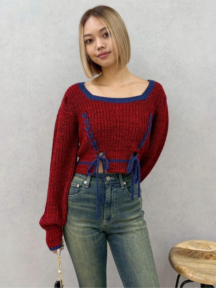 【SALE】EVRIS メランジバイカラーショートニットトップス 3725626029