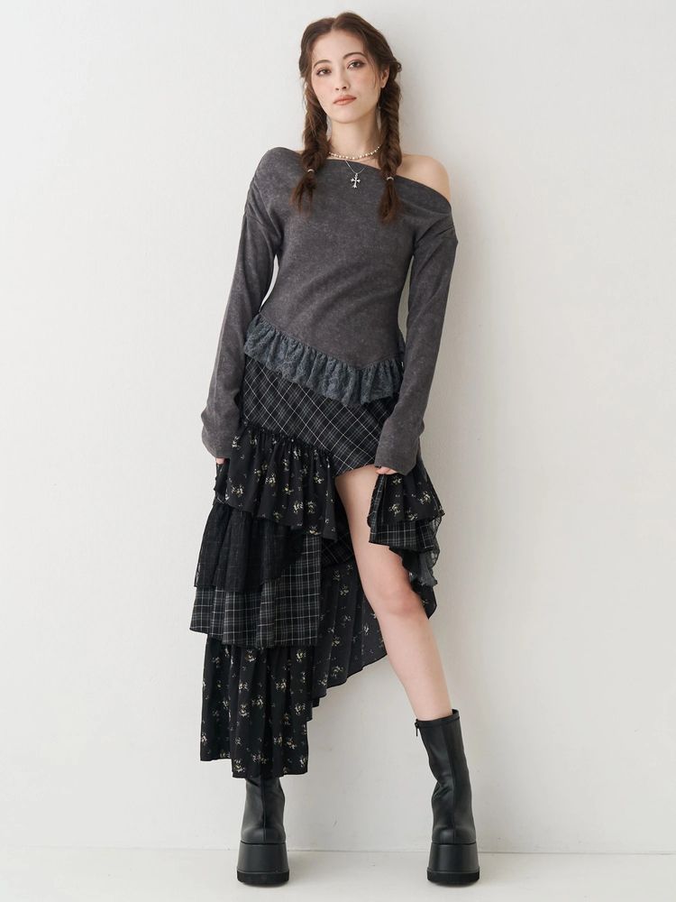 【SALE】EVRIS スリーブデザインチェックアシンメトリースカート 3725608007