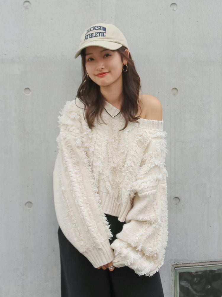 【SALE】UNGRID ワンショルフリンジケーブルショートニット 1125627122