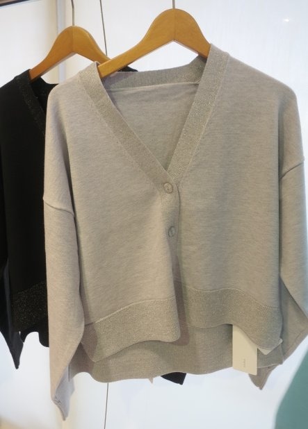 前立て部分、袖口、裾部分の控え目なラメがポイントのニットVカーデです。