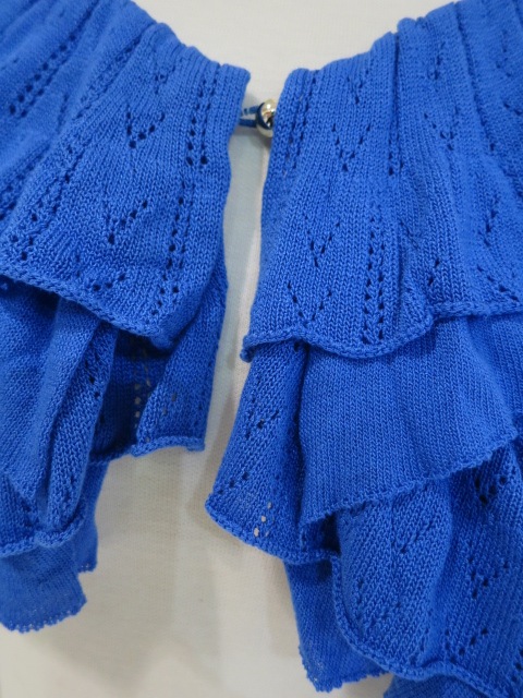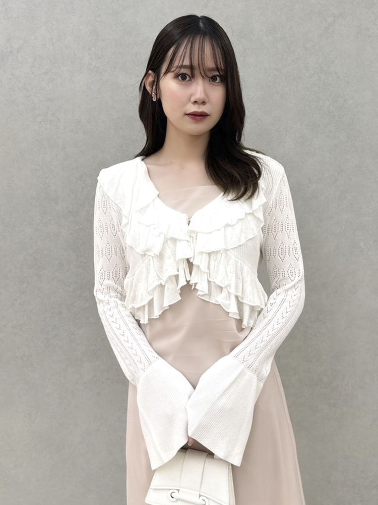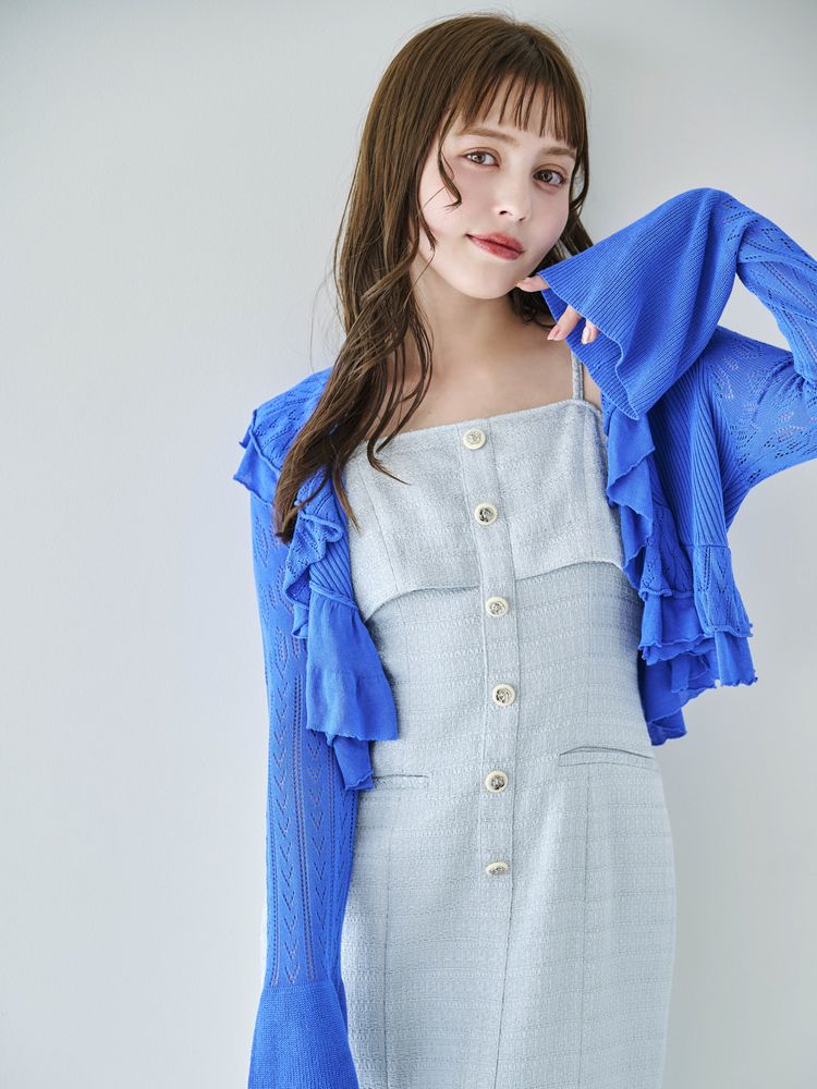 袖部分はクロシェ編みで清涼感を出しながらも優しい印象になります。 さらっとした糸を使って春らしく清涼感をプラスしました。 ボタンを止めればショートトップスとしても着用できます。 【スタイリング】 キャミワンピースを合わせたフェミニンなスタイリングがおすすめです。