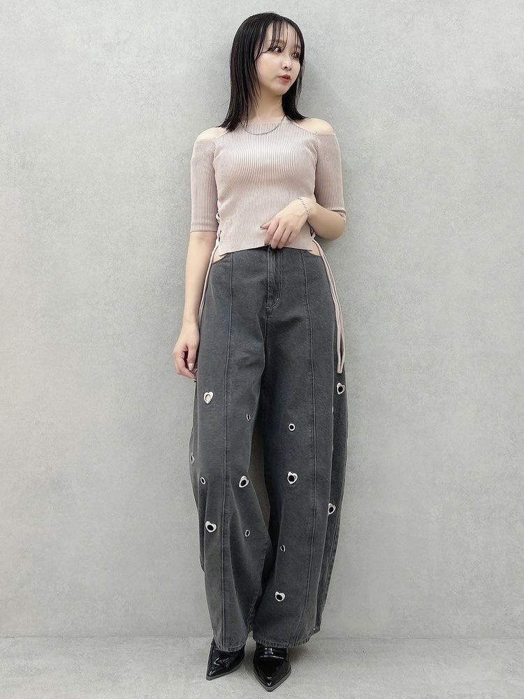 アメスリデザインを今季らしくアレンジしたアイテム。 細身のリブでコンパクトにシャープに仕上げておりスタイルアップを実現します。 裾のレースアップは結ばず、ゆらりとした躍動感が楽しめるのがポイント。