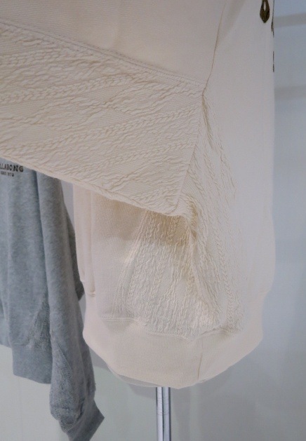 ミニ裏毛のボディにで、サイドをストレッチジャガードで切り替えた、異素材ミックスが特徴のクルーネックトレーナー。広めのボートネックがポイントで、ドロップショルダーの太めの袖でゆったりと着こなせるLOOSE CROPPEDシルエットです。首元にはガゼットを取り入れ、ユーズドライクなデザインに仕上げました。バックロゴはレオパード柄のフロッキープリントと、同色のラメがさりげなく光るフロッキープリントの2パターンでご用意。