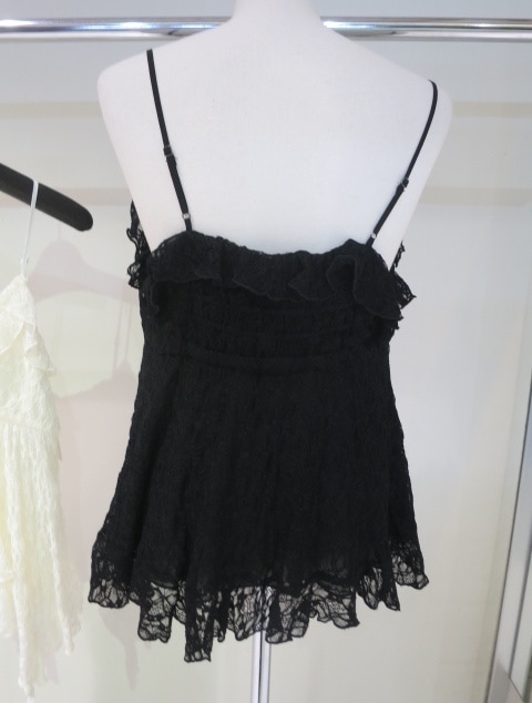 繊細なストレッチレースを使用したトレンド感のあるキャミソール。フリルをたっぷりと施したこだわりの詰まった一枚です。身頃は程よくフィットさせる事で着膨れせず体のラインを綺麗に見せてくれます◎シンプルなインナーはもちろんシャツとのレイヤードスタイルがオススメです。華やかなアイテムなのでシンプルなボトムに合わせるだけで着映えする存在感あるアイテムです。