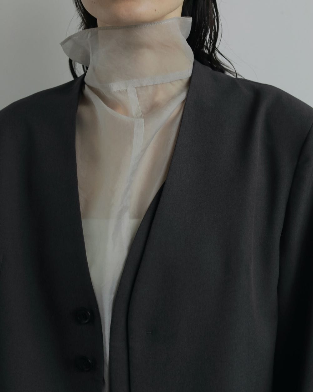 ストレッチ性のある平織りの杢調素材で仕上げたノーカラージャケット。しわになりにくい、肌触りの良い素材です。左身のフロントを2枚重ねたディテールがポイント。前を閉じるとボタンが見えず、ポケット口は細めの両玉縁ポケットでスッキリと仕上げています。ミニマルなデザインながら、重なったフロントデザインがスタイリングのアクセントに。同素材のHeather Stretch PantsやHeather Stretch Middleskirtとセットアップで着るのもおすすめ。少しブルー味のあるなんとも言えない絶妙な色合いで、着るだけで洒落感の出るカラーです。