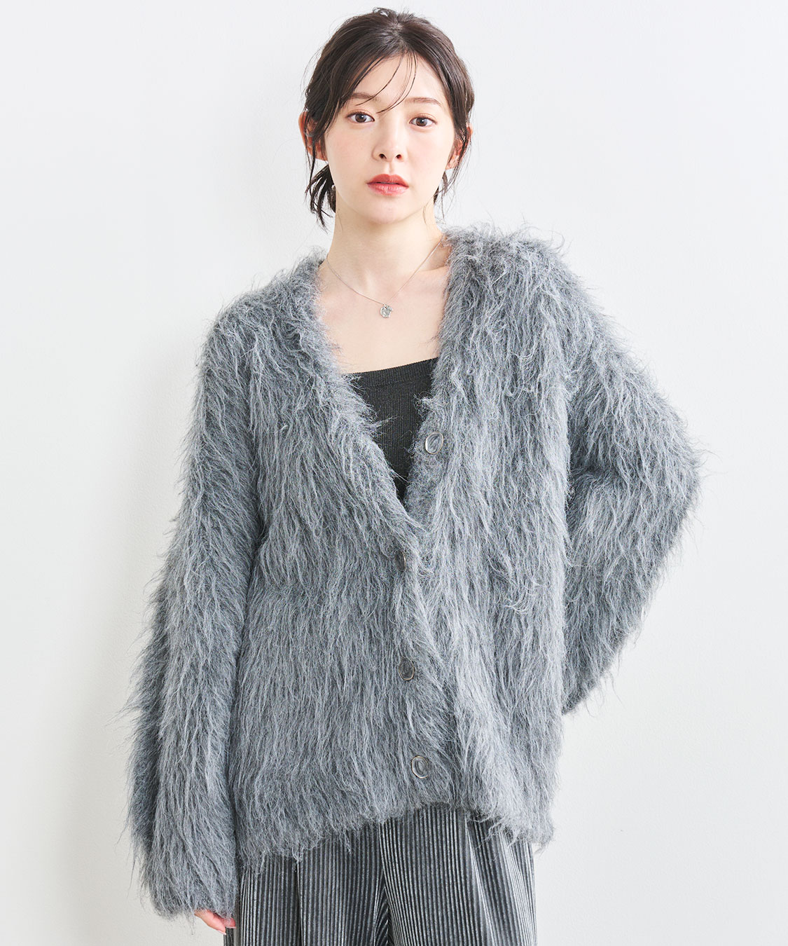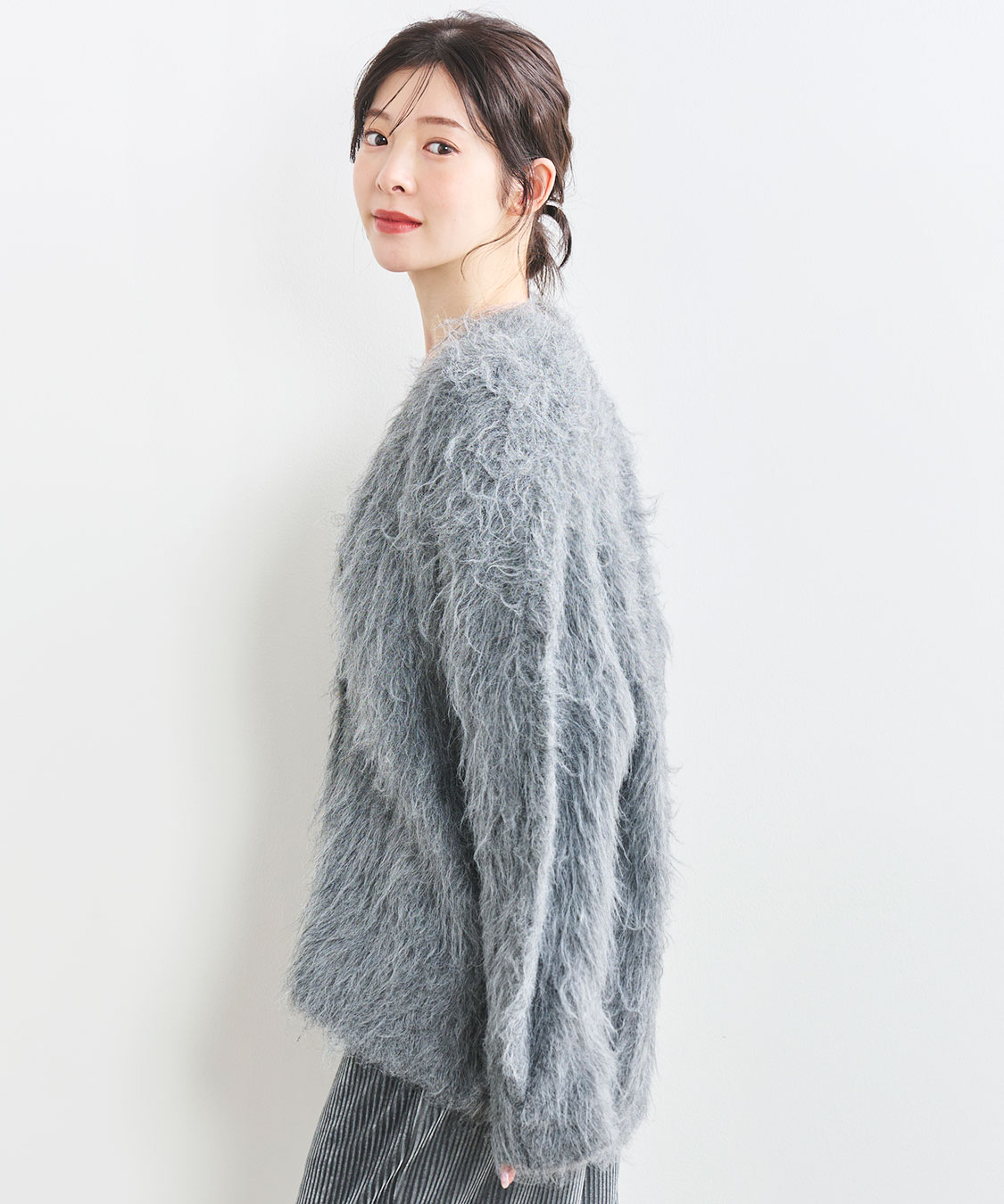 ふんわりとした毛足の長い起毛が特徴のロング丈カーディガンです。軽アウター代わりにも使える肉のあるタイプで、冬にはアウターのインにも着られます。ボタンは色によって変えていて、アイボリーには2種類のニュアンスの形のゴールドでアクセントに。ピンクにはシックに金縁に白マーブル。グレーにはなじむ色合いのグレーマーブルに金縁でご用意しました。あえて第1釦を開けて後ろに抜いて着るのもオススメです。