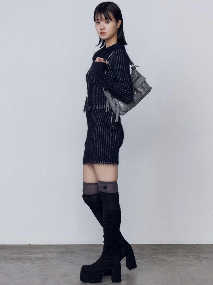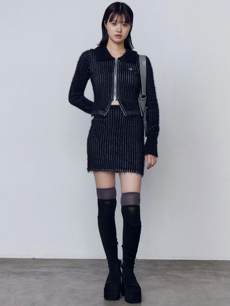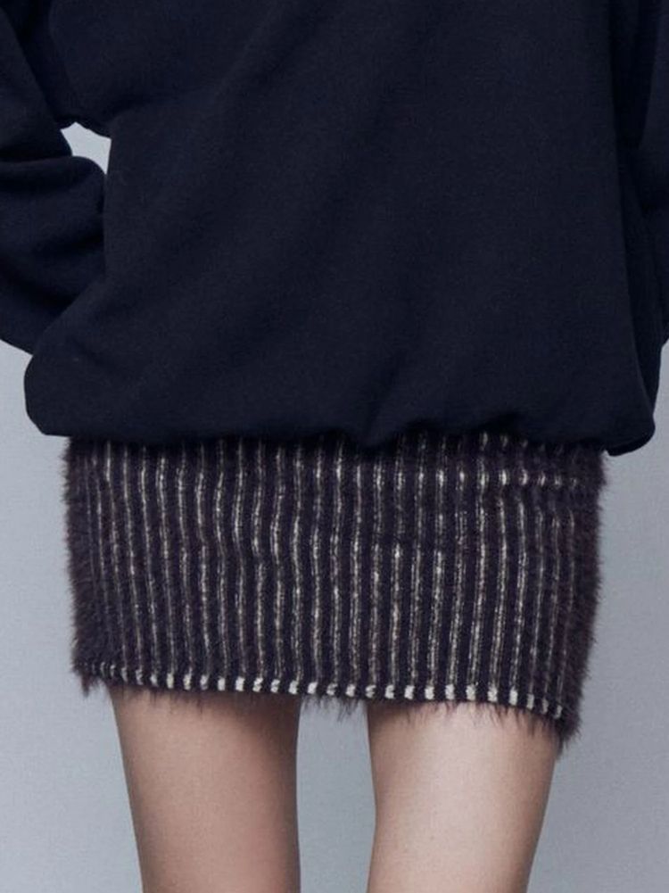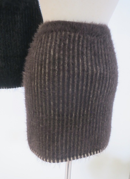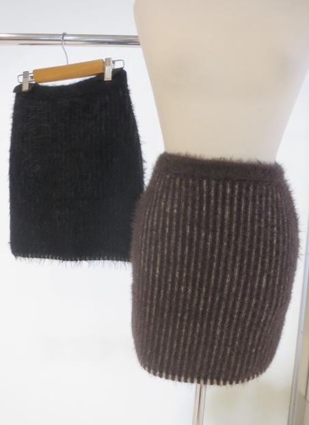 シャギーミックスのリブニットスカート ■デザイン リブの凹凸が配色に見えるプレーティング風デザインがポイントです。 タイトですが、ウエストゴムの仕様でやや伸縮性もあり着心地も抜群。 シャギー素材なので取り入れるだけで秋冬らしい印象になります。 ■スタイリング 同素材のシャギープレーティングジップトップスとのセットアップ着用も出来ます。 単品使いでは、シェービングオーバージップフーディなど今季らしい加工入りのカジュアルアイテムとの合わせがおすすめです。