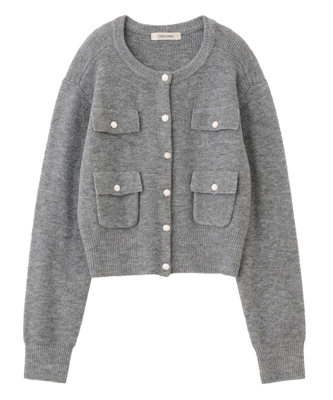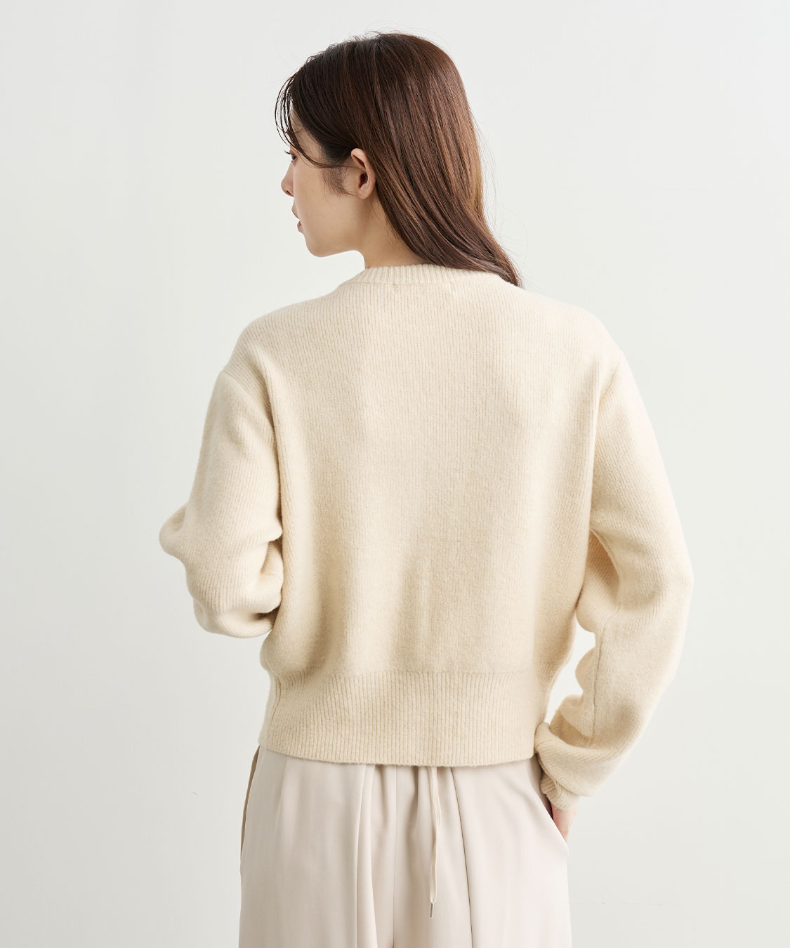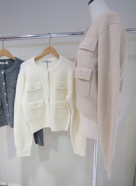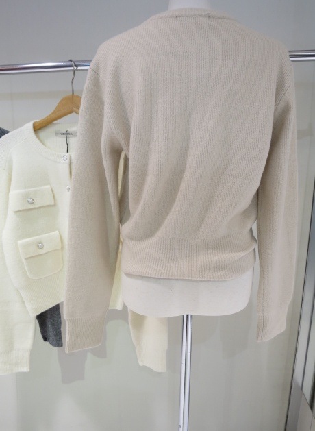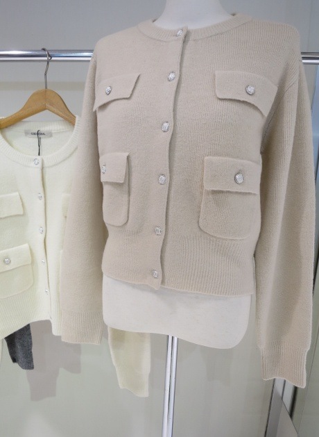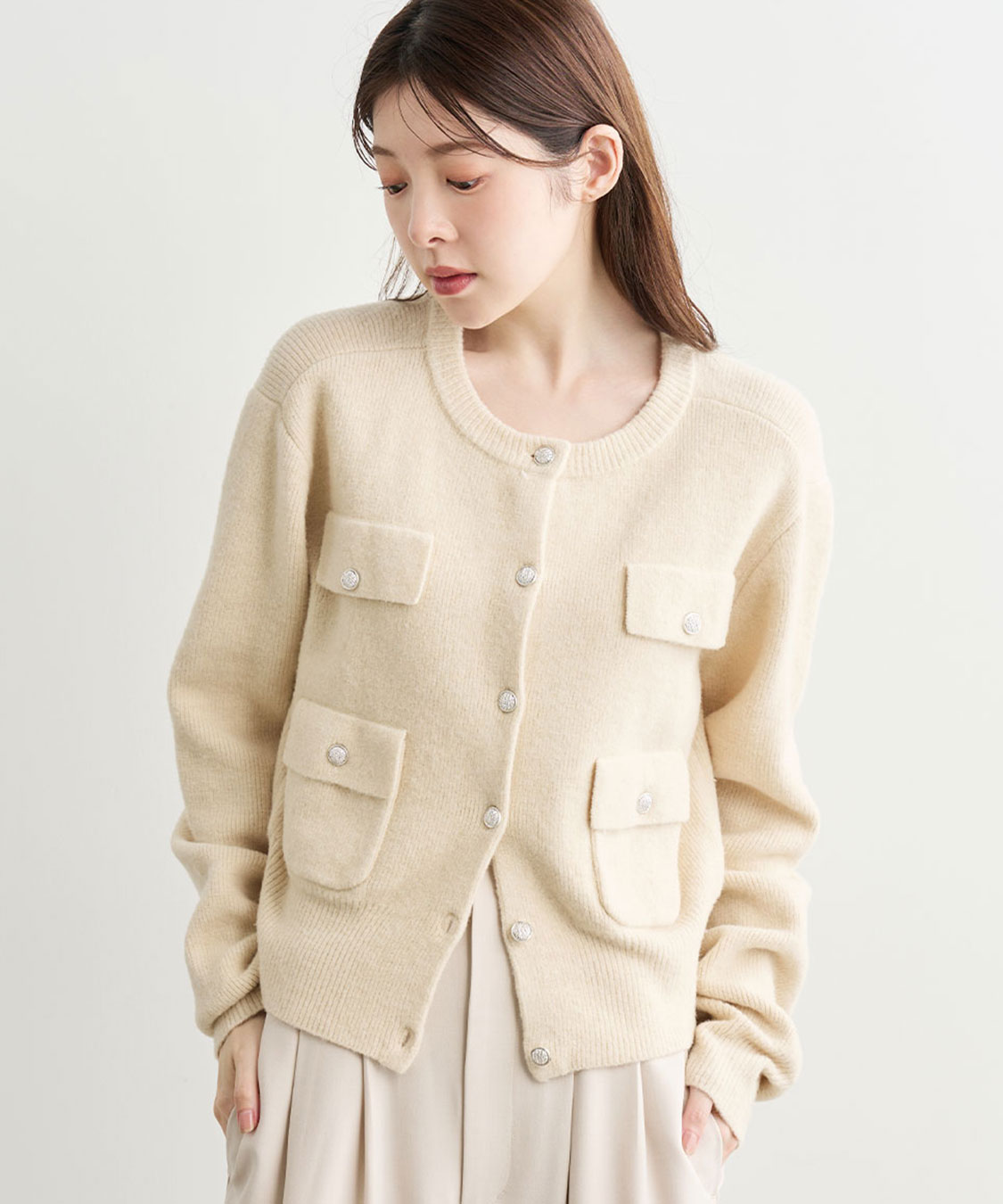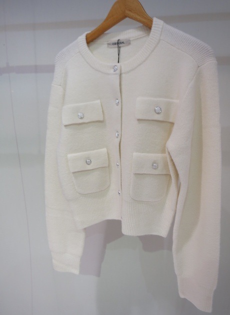 ふんわりとした柔らかなタッチのニットカーディガンです。表面感のあるブークレー糸を使った暖かみのあるアイテムです。コンパクトながら程よいゆとりのあるサイジングでカジュアルにも綺麗目にもお使いいただけます。ボタンを閉めてプルオーバーとして着用するのもオススメ◎フラップとパッチポケットのデザインがシックかつ洗練された雰囲気で目を惹きます。上品なゴールド釦もアクセントになっています。