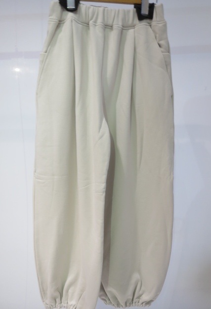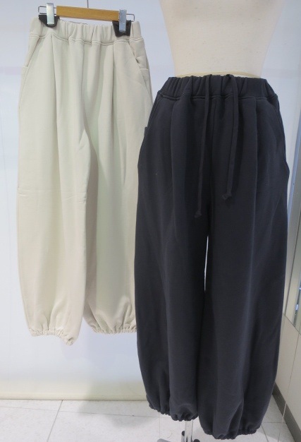肉厚なスウェット素材を使用したタックワイドパンツ。落ち感のある素材が描く、ぽってりとした丸みのあるシルエットが魅力。ウエストはドロスト仕様で、気分や体型に合わせてフィット感の調整が可能で、裾に施したゴムが、足元に自然なボリュームとニュアンスを添えてくれます。短めの着丈のアウターと合わせるとバランスが良く、ダウンやレザーなどの重めなアイテムともすんなり馴染む一枚です。